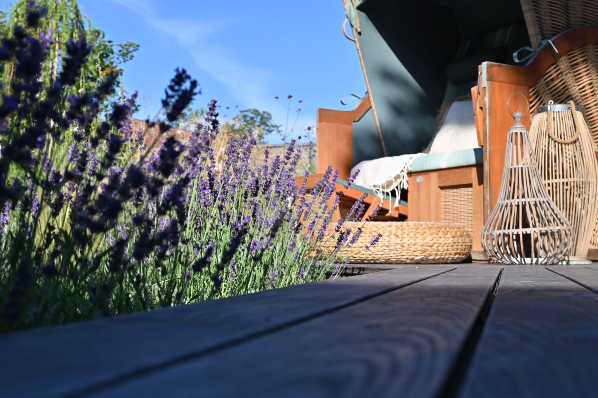Die vorhandenen Solitärbäume wurden fachgerecht gepflegt, große Sträucher aufgeastet, um darunter neue Pflanzflächen zu schaffen. An einer Grundstücksseite wurde bewusst geöffnet, um mehr Sonne in den Garten zu holen und Platz für eine neue Stauden- und Gräserpflanzung mit Dünen- und Wiesencharakter zu schaffen – inspiriert von norddeutschen und schwedischen Landschaften, passend zum Strandkorb, der als Urlaubsmitbringsel (bisher ohne "Standort") Ausgangspunkt für die Planung war und zum neu geplanten Gartenhaus (Wunsch der Gartenbesitzerin für ausgelagerte DIY-Objekte). Der Dachvorsprung des Gartenhauses wurde so bemessen, dass dort künftig der Strandkorb bequem im Winter gelagert werden kann.
