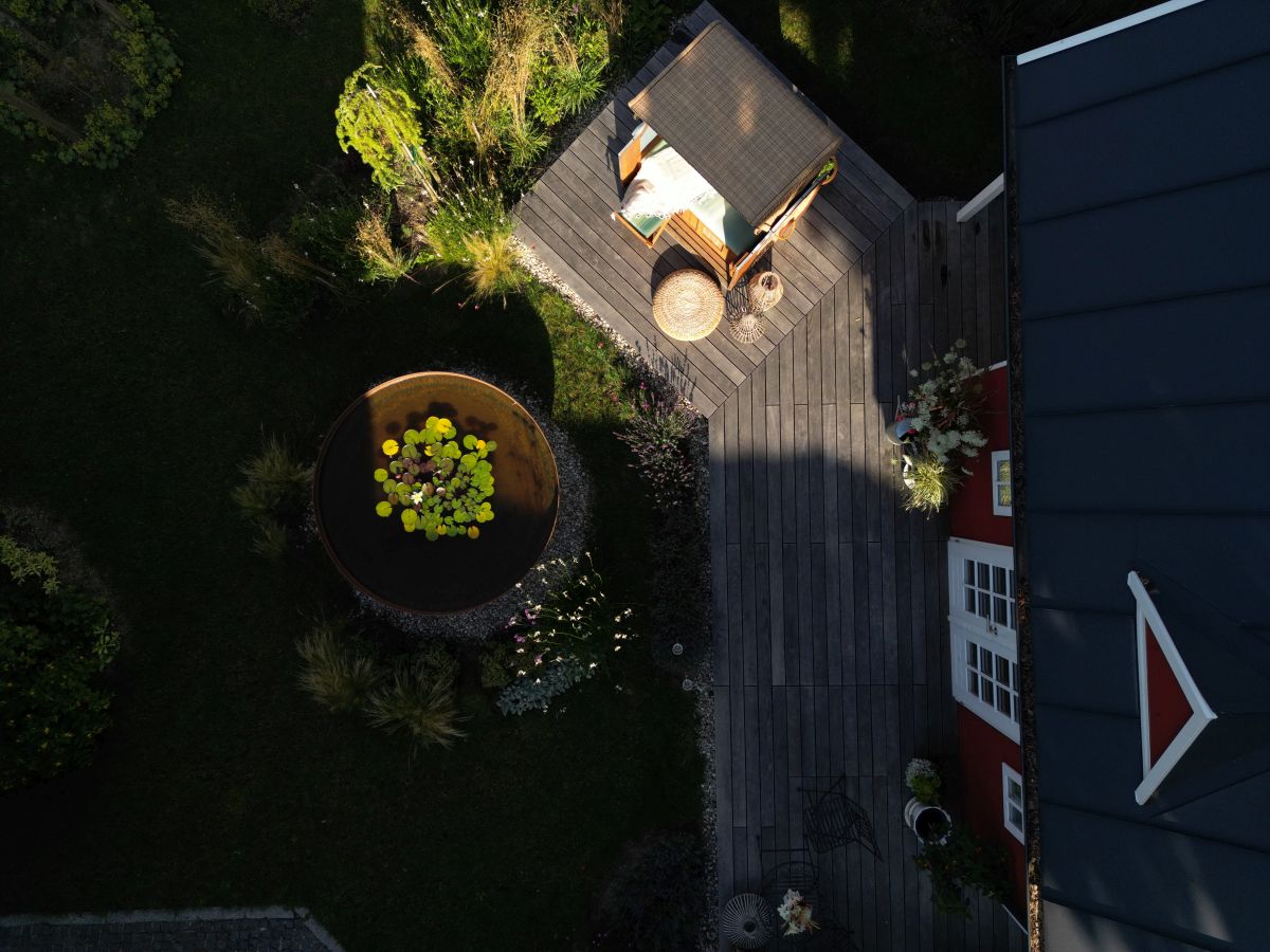 Dem Wunsch nach Wasser wurde - anstelle des ursprünglich angedachten Teiches bzw. Tauchbeckens - mit einer extravaganten XXL-Cortenstahlschale Rechnung getragen (ein Upcycling Projekt), welche grandios das Gartenhaus spiegelt und von einer Seerose gekrönt wird.