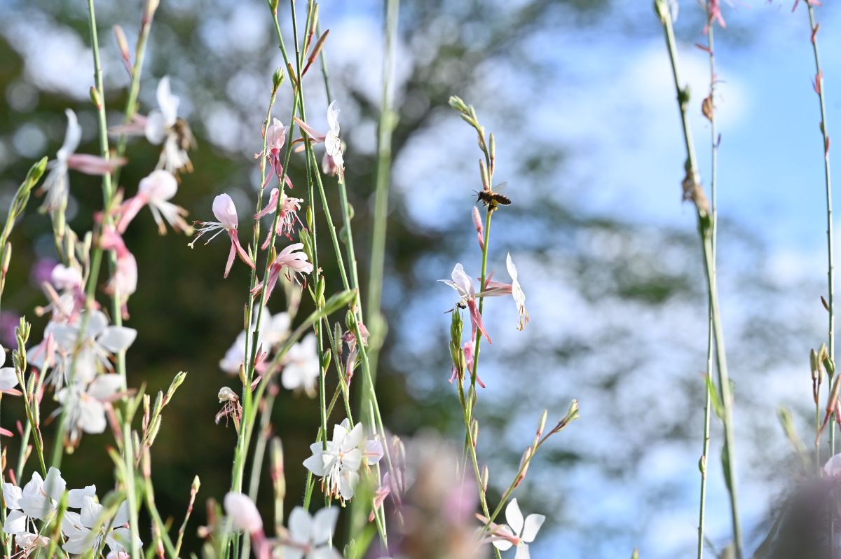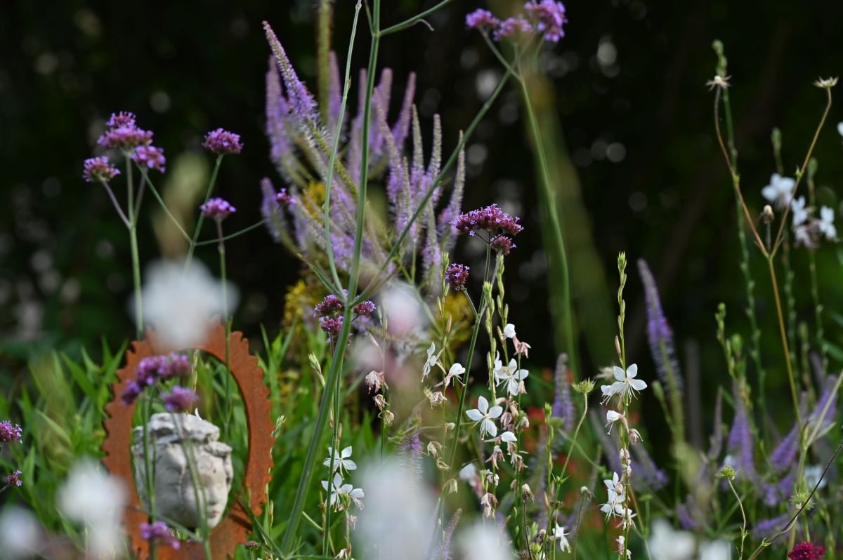 Bestehende Pflanzen wurden neu gruppiert und mit sogenannten „Sehnsuchtspflanzen“ ergänzt. Besonders wichtig waren der Gartenbesitzerin Pflanzen mit emotionalem Bezug zum Garten ihrer Mutter – wie Zittergras, Kugeldisteln, Karthäusernelken und Hortensien. Ergänzt wurden diese mit klimatauglichen und insektenfreundlichen Stauden und Gräsern, die dem Garten Leichtigkeit und eine lange Blütezeit verleihen. Blau- und Lilatöne ziehen sich wie ein stilisierter Bachlauf durch die Beete, während rote Akzente sich in Blättern, Beeren und Gestaltungselementen wiederfinden...