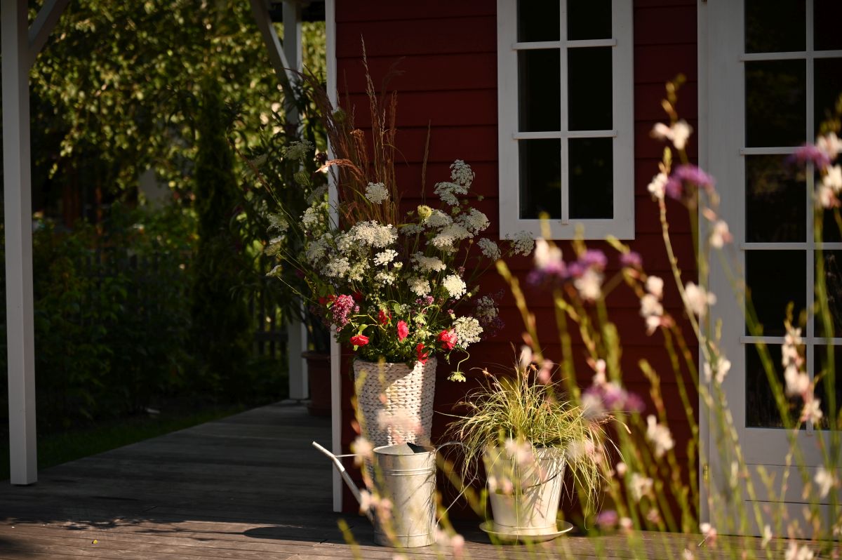 Wo früher Wildwuchs war, ist nun das maßgefertigte Gartenhaus Herzstück des Gartens im schlichten Schwedenstil (das "Schwedenrot" wurde extra in Schweden angefordert) – es könnte auch den Geschichten von Astrid Lindgren entsprungen sein… Es wurde so platziert, dass es auch Sichtschutz zum Nachbargrundstück bietet. Was ursprünglich nur als Platz für DIY-Projekte gedacht war, wurde zu einem Rückzugsort für die ganze Familie. Hier wird gebastelt während der Enkel Mittagsschlaf hält, dem Regen gelauscht oder einfach in den blühenden Garten hinausgeschaut. Zitat der Gartenbesitzer: "es ist so entschleunigend, dem prasselnden Regen am Dach zu lauschen..."